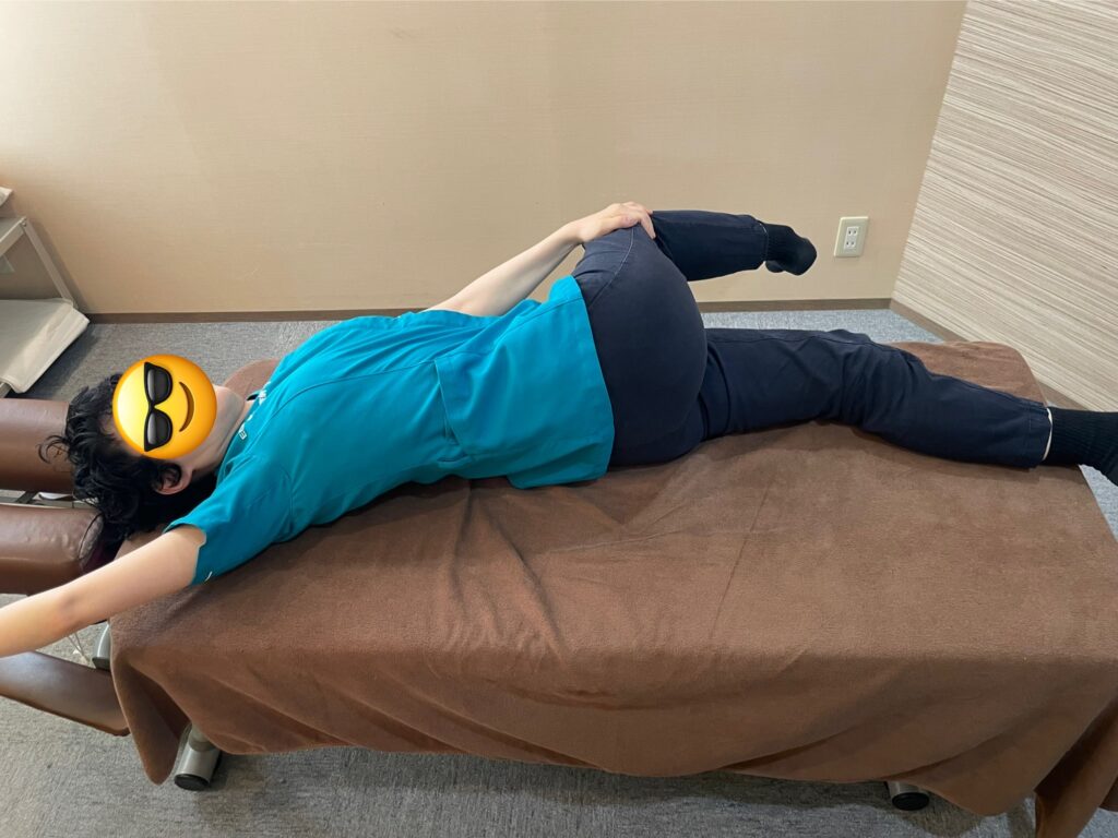・うつ伏せは腰部に痛みが出るため、体の右を上にした横向きの姿勢(右側臥位)にて鍼